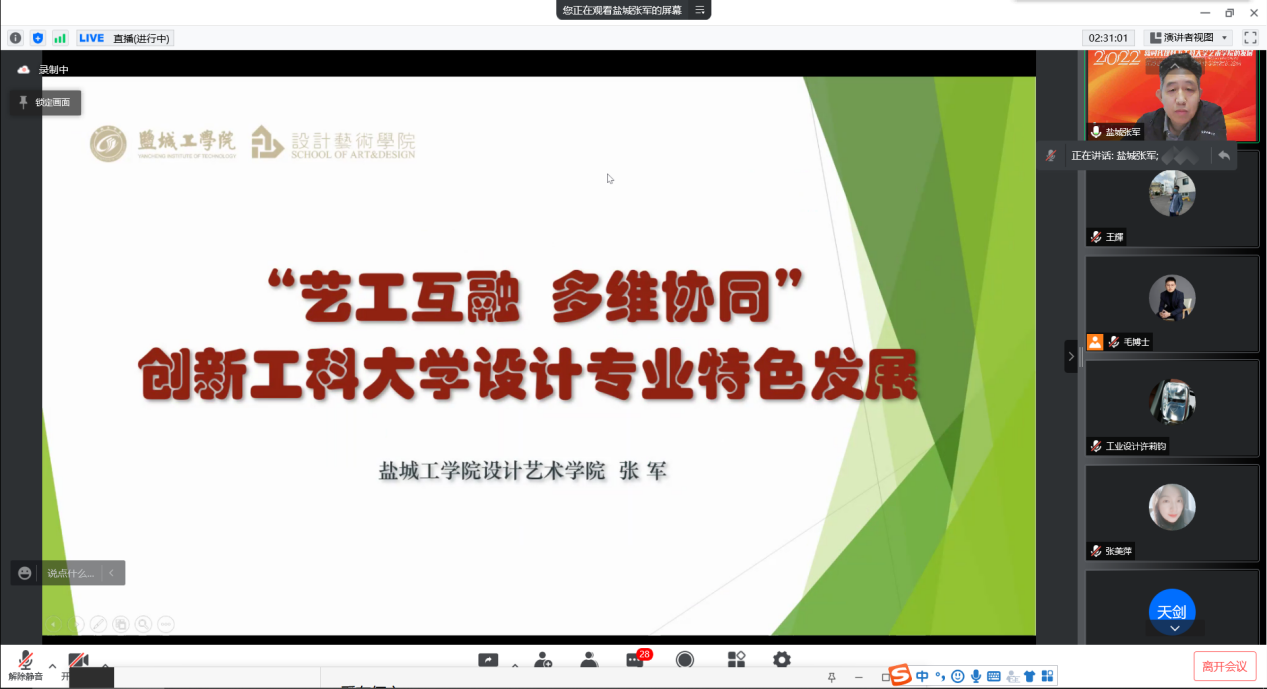 张军做了《艺工互融 多为协同 创新工科大学设计专业特色发展》的主题报告,就如何创新“艺工相融、多维协同”人才培养模式,如何开展“五元一体”人才队伍建设,如何深化“突出能力”的课程体系改革,如何推进“学用一体”的实践平台建设,如何拓展“德艺兼修”的素质教育思路,如何建构“五方合力”的基层教学组织等6个方面与各位专家进行了线上深入交流。