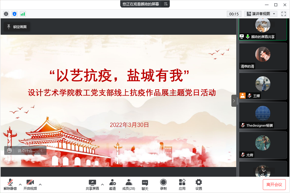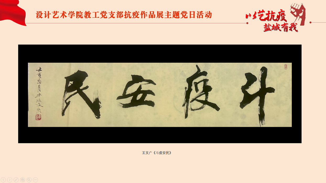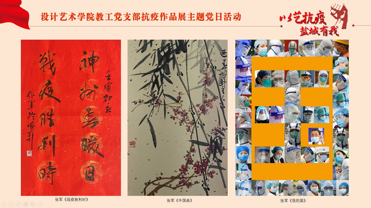 为进一步弘扬“生命至上,举国同心,舍生忘死,尊重科学,命运与共”的伟大抗疫精神,落实上级有关抗疫文件要求,助力开展防疫宣传工作,2022年3月30日下午,PA视讯集团官网教工党支部在网络云端举行“以艺抗疫,盐城有我”抗疫作品展主题党日活动。活动由党支部书记钱峰主持,支部全体党员参加。