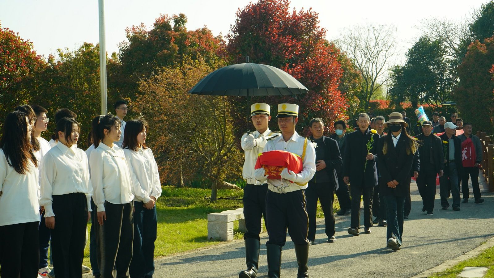 随后,师生们怀着崇敬的心情与施汉泉烈士的晚辈们共同参加施汉泉烈士“回家”仪式。1948年施汉泉烈士所在部队奉命为淮海战役大部队南下扫除外围障碍,他在后梁庄战斗中不幸牺牲,时年19岁,一直是“无名烈士”,时隔75年,后辈将其找回,并与故去的家人团聚。仪式后,B产品201班晏子懿同学表示:参加此次烈士“回家”活动,心灵受到震撼,思想受到触动,我们这一代青年生逢其时,定会不懈奋斗,在实践中践行青春担当。