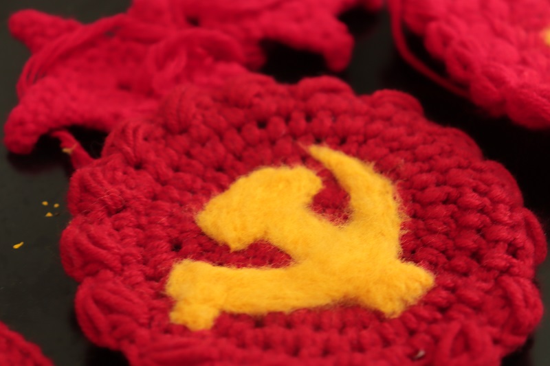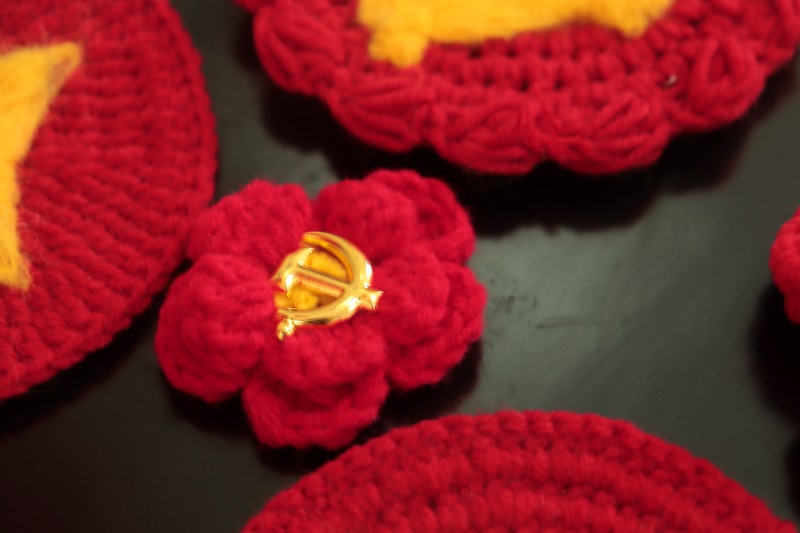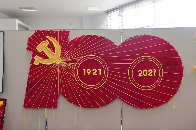 员工采用针织、裁剪等技法制作的中国共产党成立100周年庆祝活动标识。