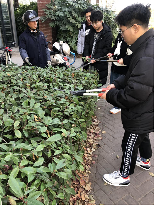 绿化养护师傅为B环艺203班员工示范慈孝竹的修剪养护