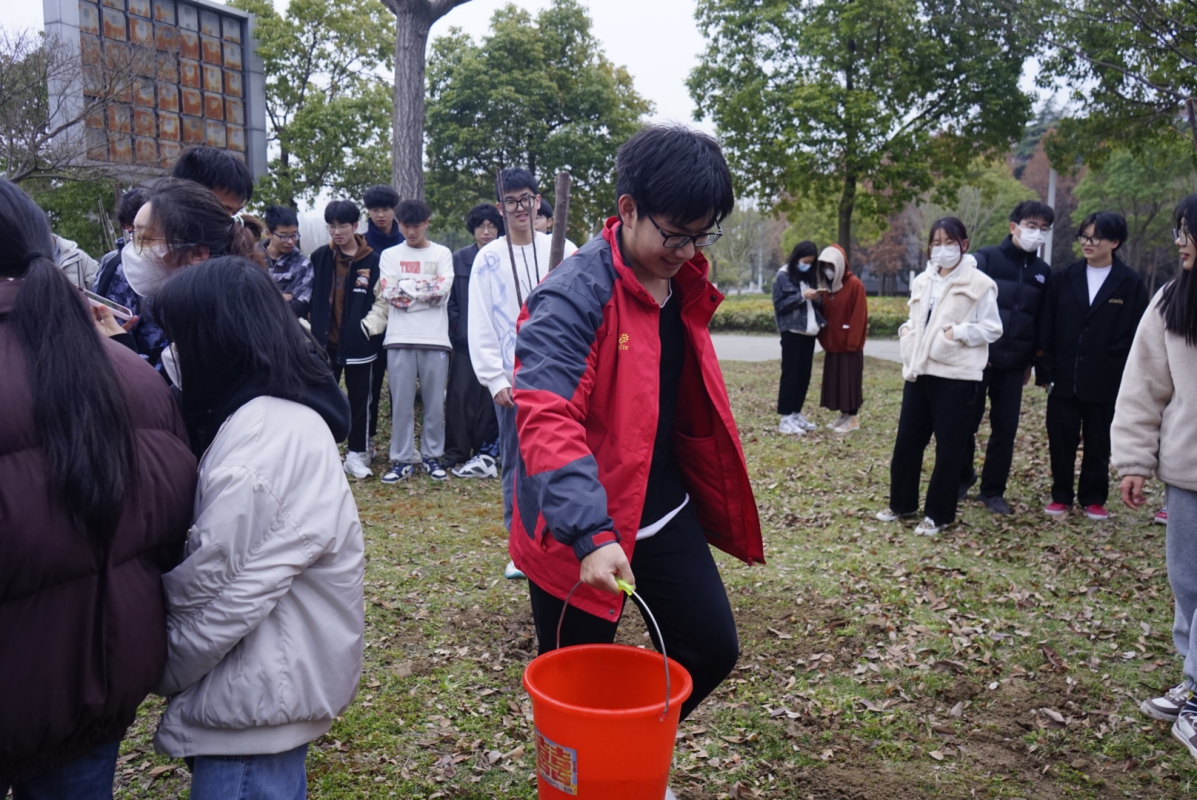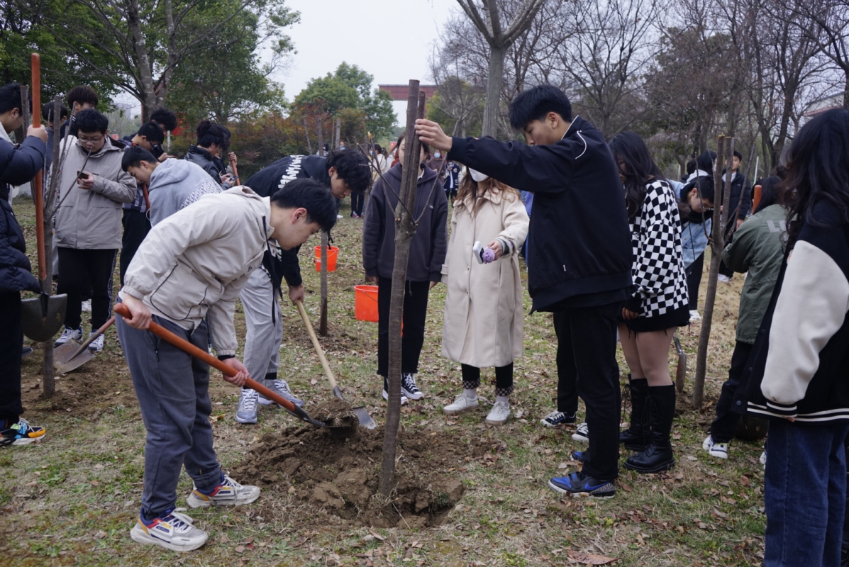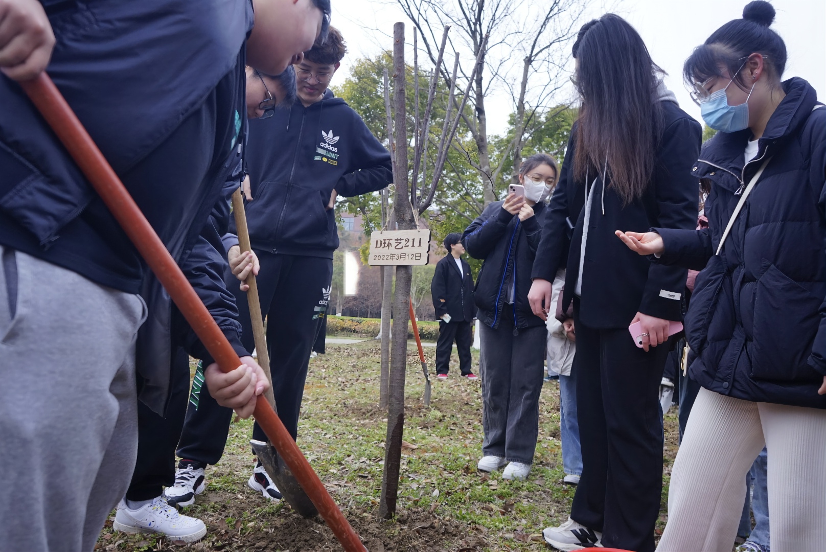 在植树现场,工作人员耐心讲解植树的注意事项,同学们以班级为单位进行分组,按照“一垫、二提、三培、四踩”的技术要领,依次完成挥锹铲土、扶苗填坑、踏土夯实等工序。同学们纷纷挽起衣袖,拿起铁铲为一颗颗新树苗安置“新家”,心中充满着对树苗茁壮成长的期盼。活动中,大二、大三学子们也在当天来看望去年种下的小树苗,并为其浇水、除草、更换新班牌,去年栽种的紫叶李和香樟树已经发芽,成活率百分之百。
