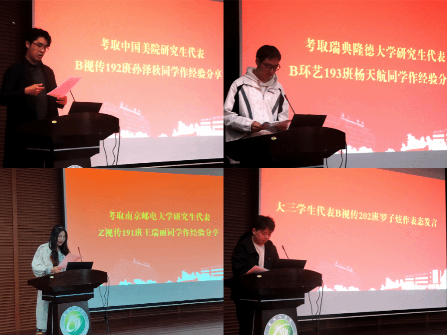 在考研经验交流环节,2023届考取国内外研究生员工代表B视传192班孙泽秋、Z视传191班王瑞丽、B环艺193班杨天航结合各自实际,从院校选择、备考技巧、心态调整等方面向参会人员分享了各自的备考历程和宝贵经验,建议同学们脚踏实地、打好基础、戒骄戒躁、坚持到底。2020级考研员工代表B视传202班罗子炫作表态发言。倡议有考研意向的同学及早规划,养成良好的学习和生活习惯,为心中的梦想不懈努力。