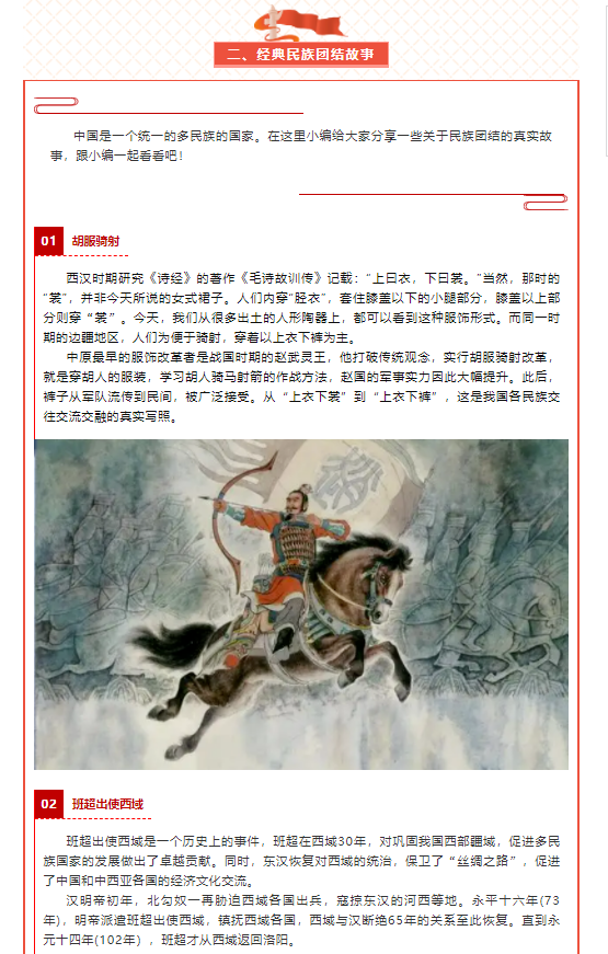 公司利用官方微信公众号,推送《胡服骑射》《班超出使西域》《昭君出塞》《凉州会盟》等经典民族团结故事,帮助员工进一步了解各民族休戚与共、书写悠久历史、创造灿烂文化、培育伟大精神的历史进程,用生动事例引导员工将爱国情融入铸牢中华民族共同体意识的行动中。
