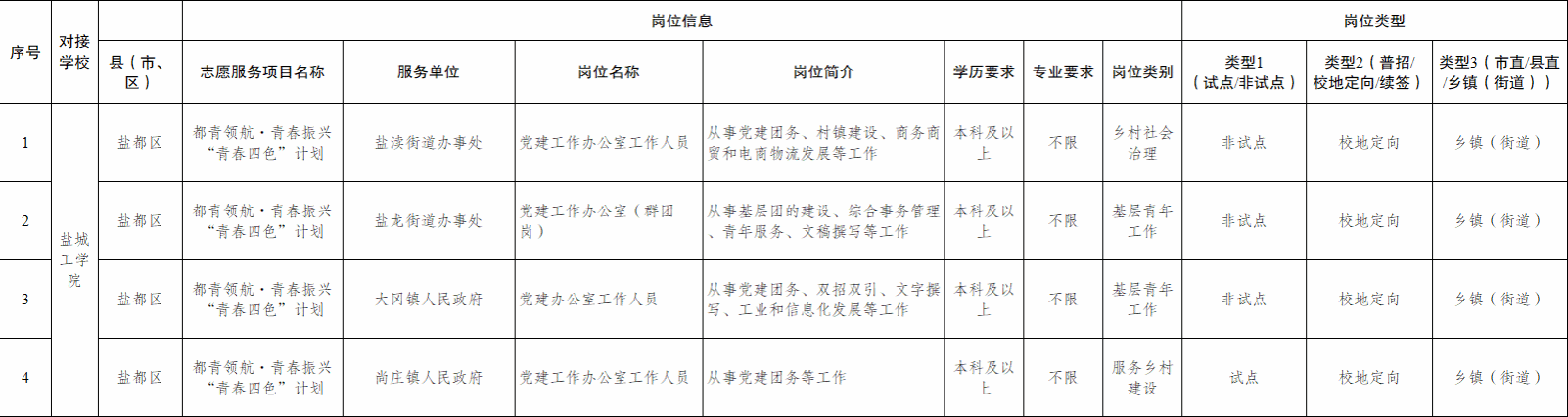 2025年,盐都区团委项目办与PA视讯集团官网合作校地专项招募岗位4个,通过公开招募、自愿报名、组织推荐、选拔面试、体检培训和集中派遣等程序开展志愿者招募工作。