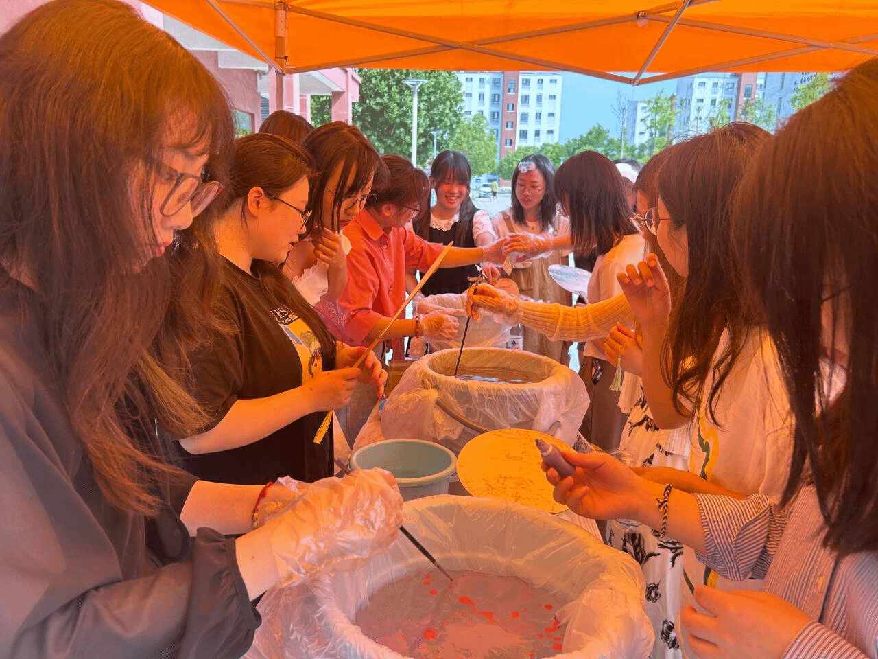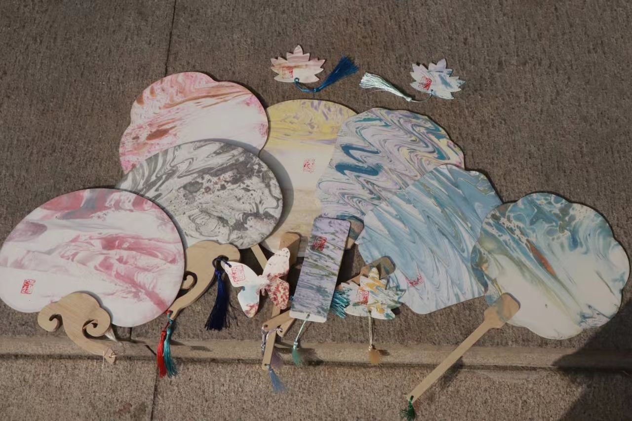 5月25日下午三点,在二期食堂门口,设艺公司志愿讲解员首先为同学们讲解漆扇的历史文化,员工会心理部同学为大家依次介绍不同颜色代表的不同情绪,不同扇形代表的不同性格。操作环节中,同学们将彩漆滴入水中,彩漆漂浮于水面,团扇缓缓入水,漆色随水附着于扇面,水因势走,色彩穿插交错随机而成各种纹理和图案,流云变幻,尽显诗情画意。最终,经过点缀扇面和装饰扇柄,各色精美的漆扇作品演绎出中华传统美学的独特魅力。同学们在与非遗文化的邂逅中收获了一份专属于自己的心理健康日礼物,也点燃了大家继续领略和探索非遗技艺、亲身实践传承非遗文化的热情。