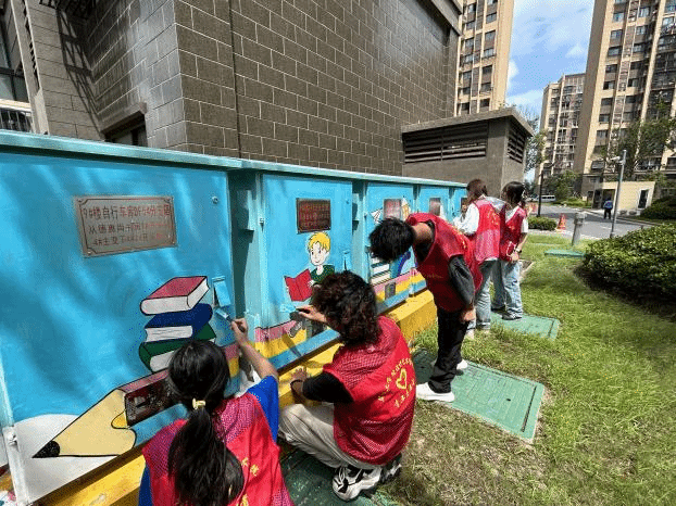 实践团成员不畏室外接近40度的高温酷暑,在课堂与户外之间来回奔波,用一周的时间为该社区绘制主题彩绘。彩绘内容包括书香社区、和睦邻里、卡通形象等,成员们用自己的双手和画笔,描绘出了平安家园、和谐邻里的美好图景,为社区增添了一道亮丽的风景线。活动过程中,成员们分工明确,从选图、起形、上色到精修,每一个步骤都有条不紊,他们手拿刷子,调颜料、勾轮廓、涂色彩,反复打磨每一幅画面,认真勾勒每一个细节,精益求精绘制艺术作品。在全体实践团成员的努力下,一幅幅生动的作品将原本斑驳的配电箱、路障石墩、墙面“改头换面”,社区居民对实践团所创作出的彩绘作品纷纷竖起了大拇指。