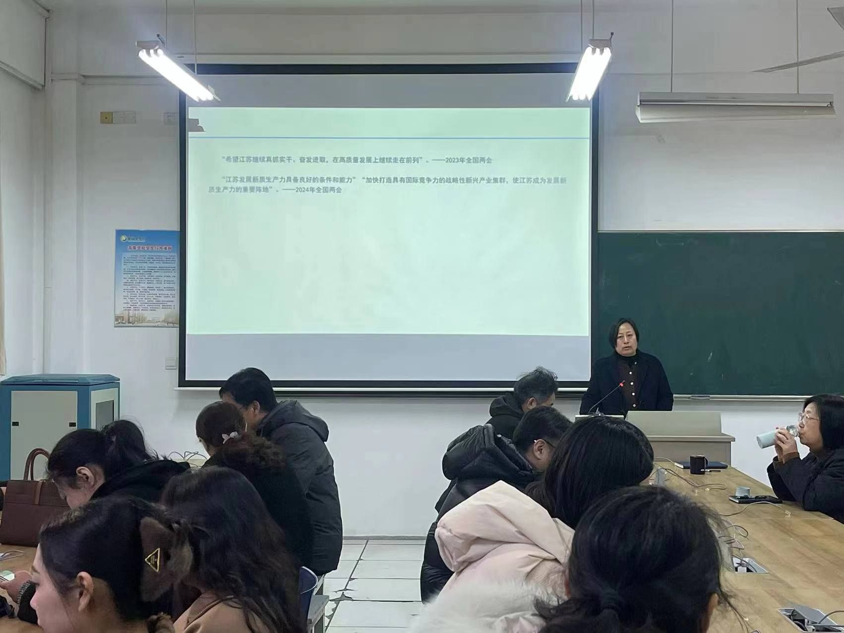 胡凌霞带领与会教职工一起学习了习近平总书记在参加江苏代表团审议时的重要讲话精神,她强调,高校老师要认真学习贯彻习近平总书记关于发展新质生产力的重要论述,把握新质生产力的本质和特点,更好地肩负人才培养、科学研究、社会服务、文化传承与创新、国际交流与合作的重大使命,为因地制宜发展新质生产力作出贡献。
