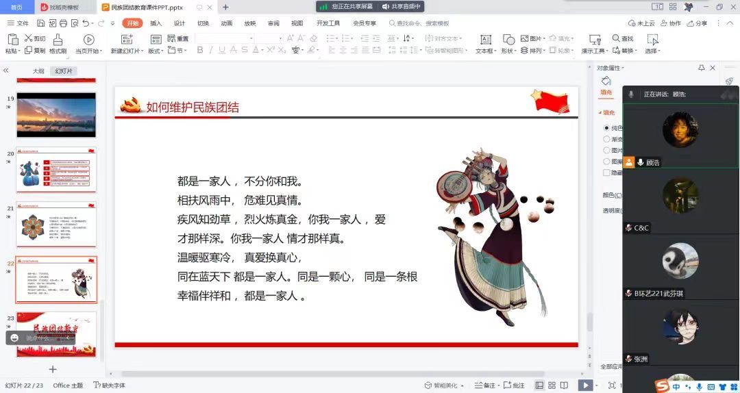 各班级利用班级QQ群、腾讯会议,积极开展民族团结进步宣传月活动。大家以线上团日活动的形式,集中学习习近平总书记关于铸牢中华民族共同体意识的重要论述及在全国民族团结进步表彰大会上发表的重要讲话精神,学习我国民族政策、学习少数民族歌曲;开展诵读经典民族团结故事、少数民族爱国诗词赏析、分享学习心得体会、主题书法展示等活动,加强对铸牢中华民族共同体意识的阐释解读和深入转化。