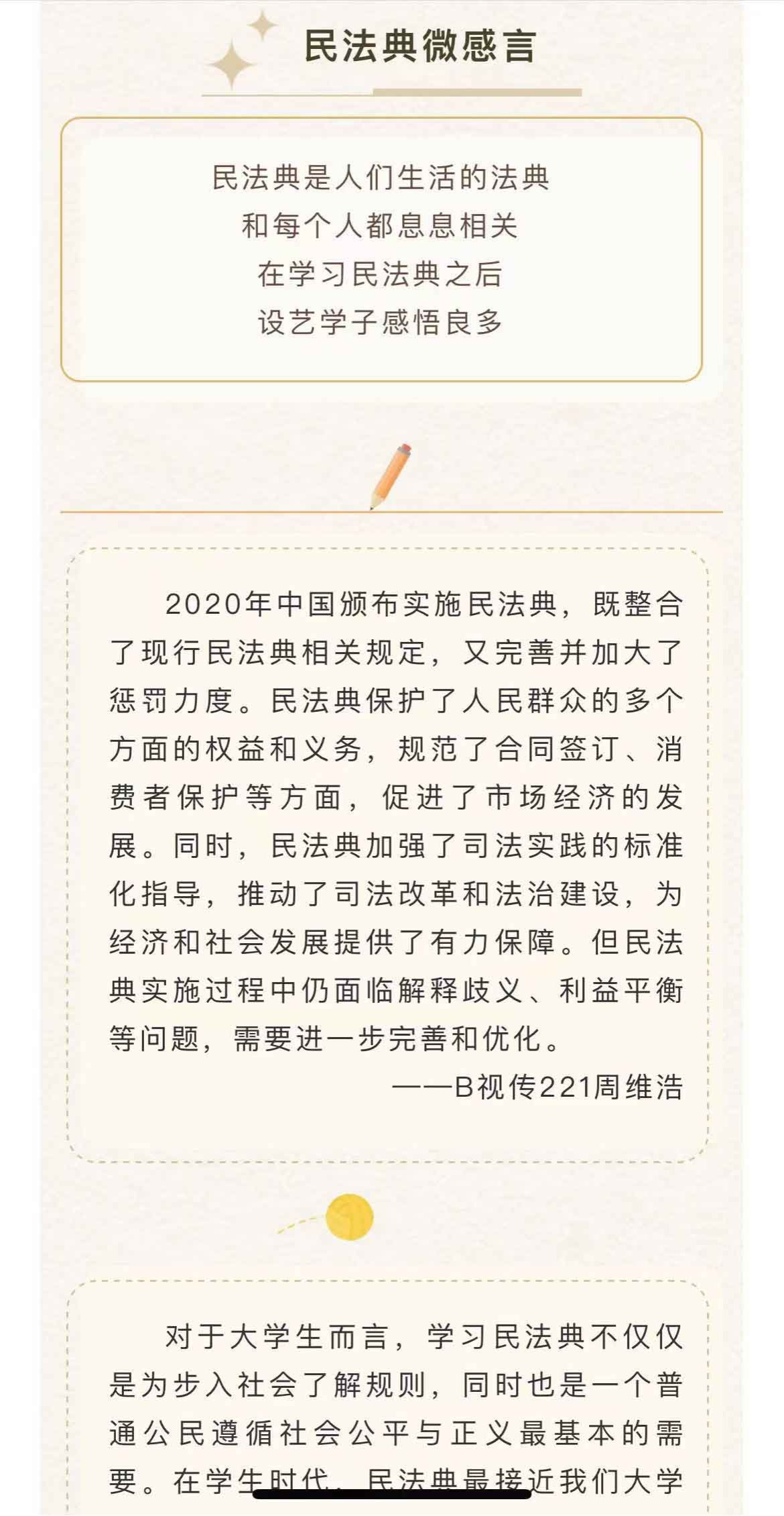 二是开展班级微感言征集活动。5月24日至30日,公司各团支部开展团日活动,学习了解民法典内容,深入理解民法典与日常生活之间的联系,引导员工不仅要遵法守法,更要有学法的主动性,真正做到学法、懂法、守法、用法。同学们踊跃参与,主动分享学习成果,活动共收集三十余条微感言,公司在微信公众号中选登部分微感言进行展示。B环艺222刘珺怡在微感言中表示:作为新时代的一名青年,要知法、懂法,学会用法律的武器保护自己,更需要严格按照法律的准绳规范自己的言行,把追求公平正义作为一种政治追求和道德情操,贯彻于学习、工作和生活的各方面、全过程。