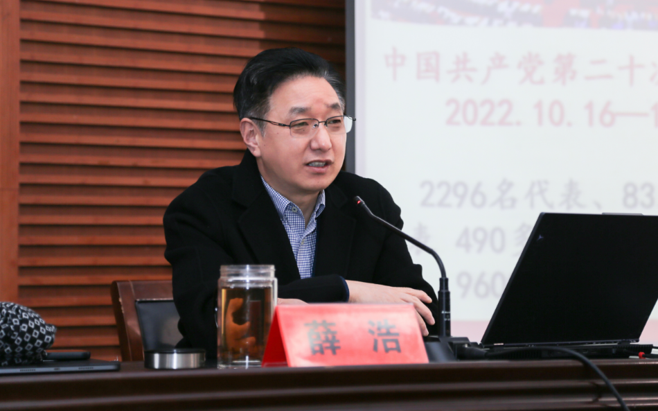 薛浩介绍了党的二十大的基本情况,从党的二十大的主题和主要成果、新时代10年的伟大变革、开辟马克思主义中国化时代化新境界的历史责任、中国式现代化的丰富内涵、全面建设社会主义现代化国家的目标任务、以党的自我革命引领伟大社会革命的重大要求、“三个务必”的谆谆教导和团结奋斗的时代要求、“两个确立”的决定性意义和实践要求等八个方面对党的二十大报告进行了系统阐释和深入解读。薛浩强调,要把学习宣传贯彻党的二十大精神作为当前和今后一个时期的首要政治任务,要更加深刻领悟“两个确立”的决定性意义,增强“四个意识”、坚定“四个自信”、做到“两个维护”,弘扬伟大建党精神,坚持为党育人、为国育才,自觉把思想和行动统一到党的二十大精神上来,将党的二十大精神转化为推动公司、公司事业高质量发展的强大动力,为建设高水平一流应用型大学努力奋斗!