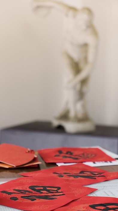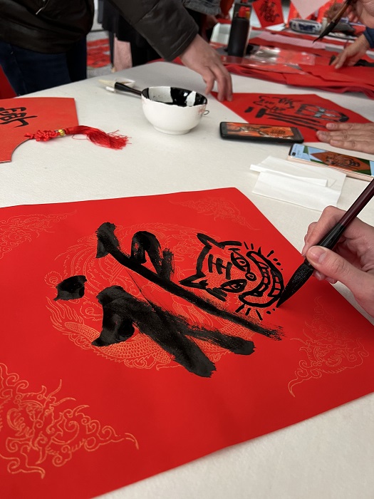 活动一开始,就吸引了众多教师的热情参与,党员们现场书写了近百副春联,隶书、楷书、行书等多种书体各显神韵。“春花含笑意,爆竹增欢声”“丹凤呈祥龙献瑞,红桃贺岁杏迎春”……一副副散发着清新墨香的大红春联展现在人们眼前,喜庆的话语蕴含着浓浓的年味。几位老师现场即兴创作,将可爱的小老虎融入“福”字斗方之中,为虎年新春增添了几分“生气”;在精美的扇面和卷轴上创作水墨小品画,绽放的腊梅尽显春意。老师们一边欣赏书法创作,一边品评春联寓意,现场一派欢乐景象。