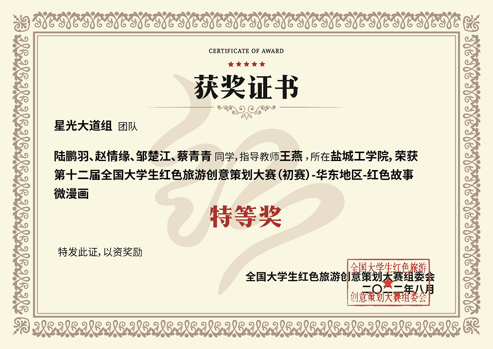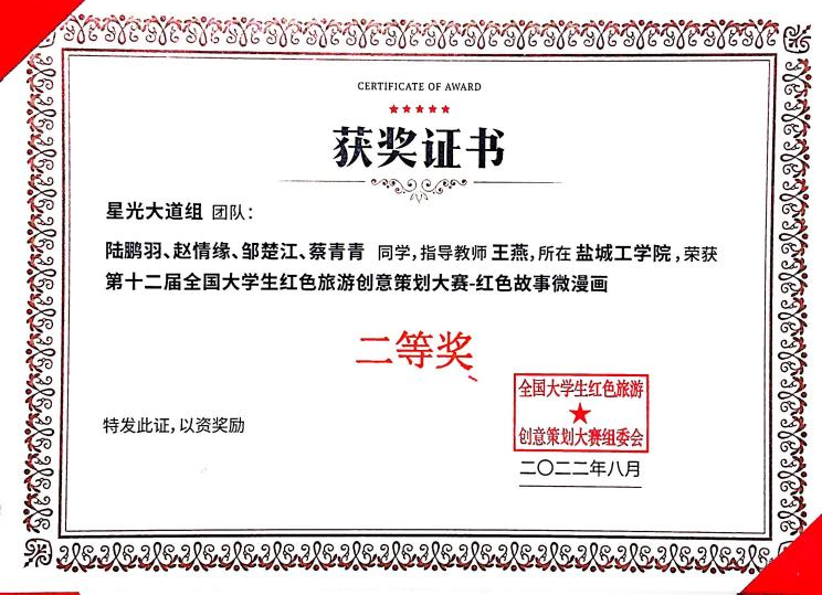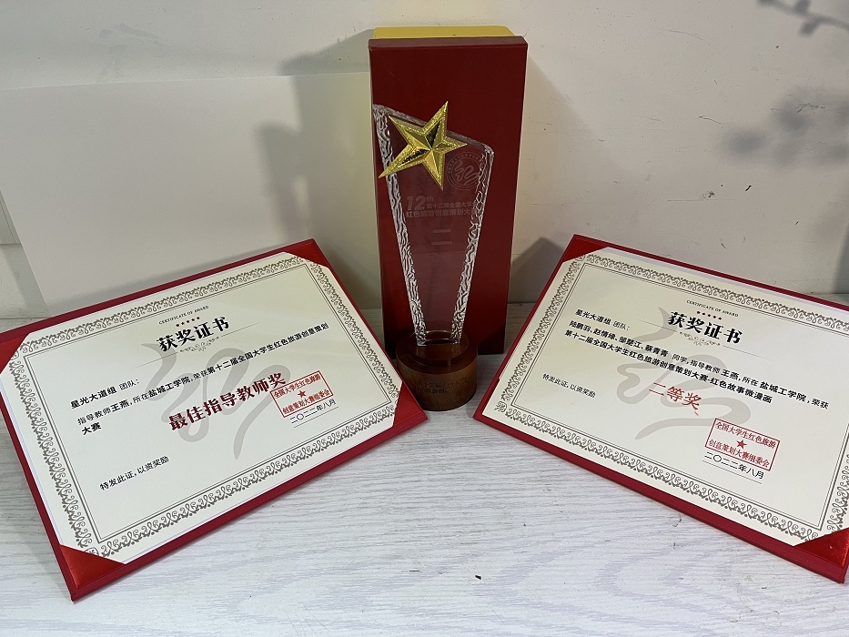 本届大赛共分为省级初赛与全国赛两个赛段。由王燕老师指导2019级环境设计专业员工陆鹏羽、赵情缘、邹楚江、蔡青青组成的“星光大道”团队,作品《万千“器”象,“器”象万千》以华东赛区唯一特等奖的成绩入围全国赛。终评环节,团队经过视频创作、线上答辩、导师评审等环节,作品《陕陕红星》获得“红色故事微漫画”类全国二等奖,指导老师王燕获“最佳指导教师”荣誉称号。