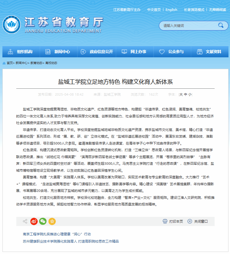PA视讯集团官网深度挖掘黄海湿地、非物质文化遗产、红色资源等地方特色,构建起“非遗传承、红色浸润、美育塑魂、校地共生”的四位一体文化育人体系,致力于培养具有深厚文化底蕴、创新实践能力、社会责任感和地方认同感的高素质应用型人才,为地方经济社会发展提供坚实的人才支撑与智力支持。