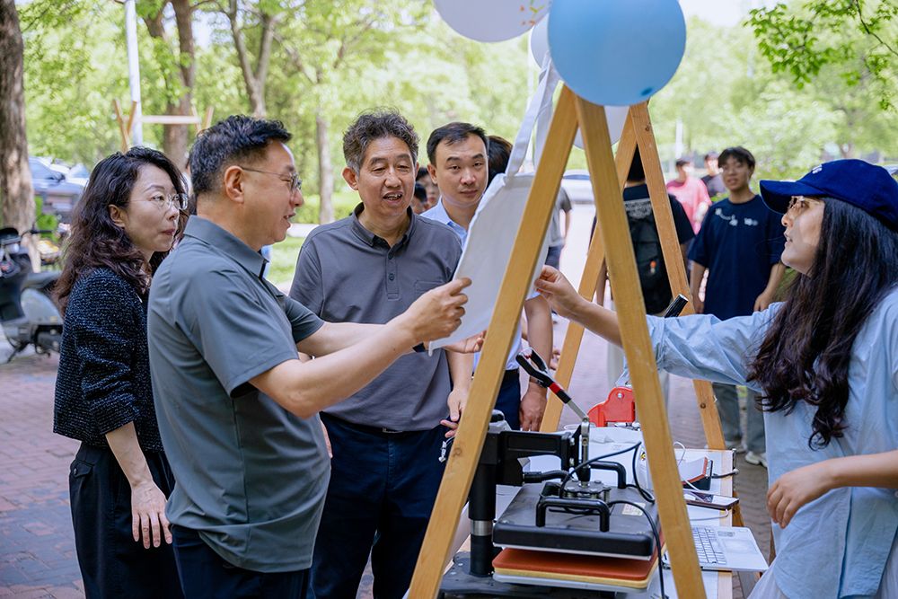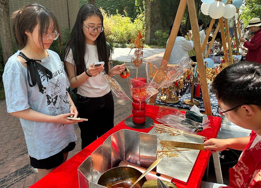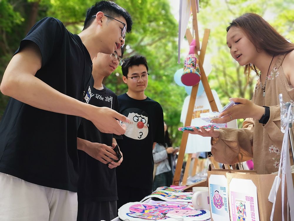 薛浩对“创意市集”这种展示形式给予了充分肯定,与前来布展的盐城非遗传承人以及员工“摊主”们进行了亲切交流,询问各类文化创意产品的设计理念、制作工艺等,鼓励同学们要敢于创新,大胆实践,不断在在创新实践中增本领、长才干。非遗传承人们制作的面塑、糖画、葫芦糖画以及同学们亲手设计制作的徽章、坠饰、布袋、T恤等琳琅满目的创意作品吸引了众多师生驻足欣赏、体验和选购,各展位前人头攒动,整个市集现场热闹非凡。同学们巧妙地将传统手工技艺与现代时尚元素相融合,创作出了一件件既具有传统文化韵味又不失现代感的精美作品,赢得了现场师生的赞许和认可。