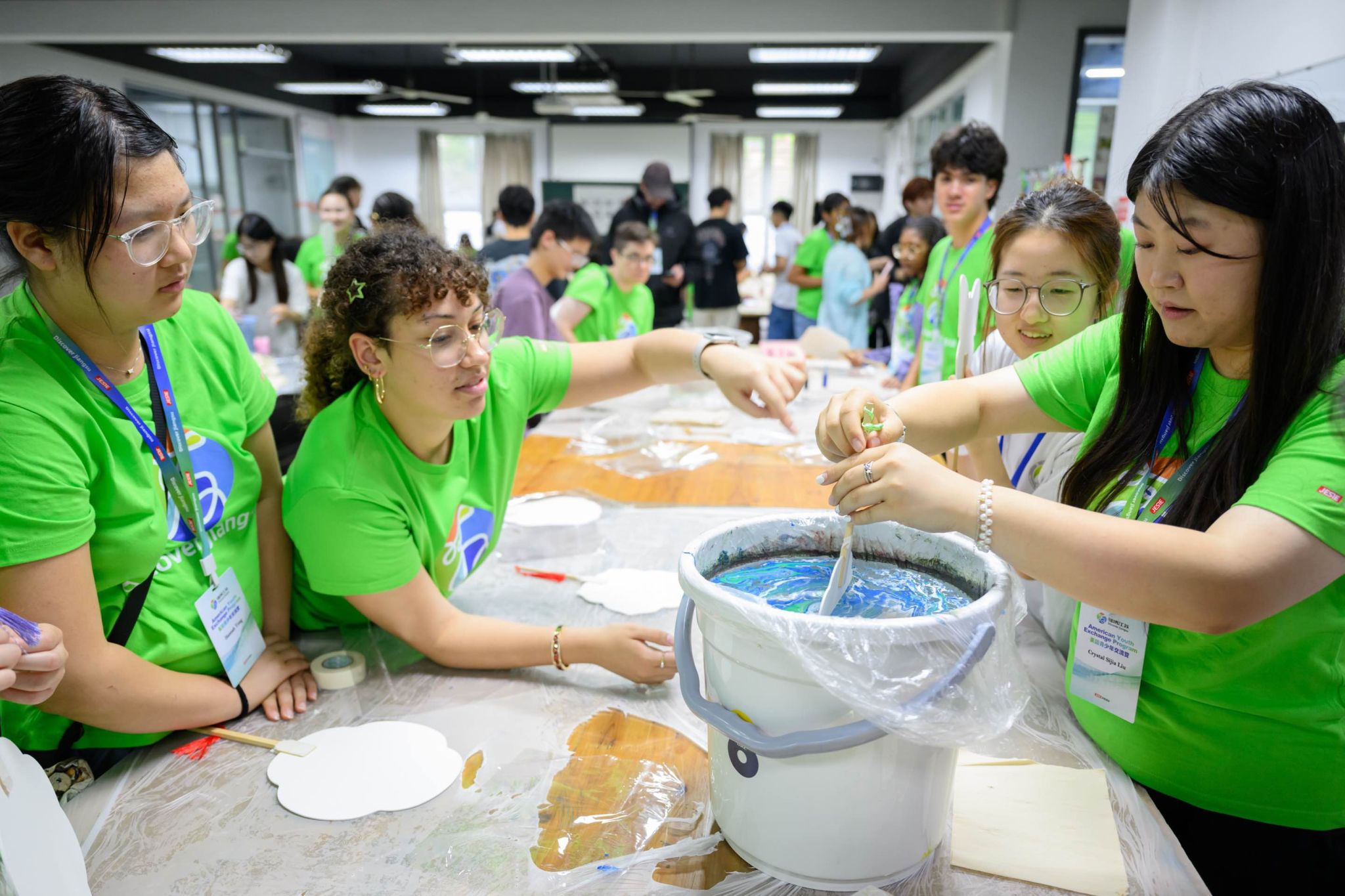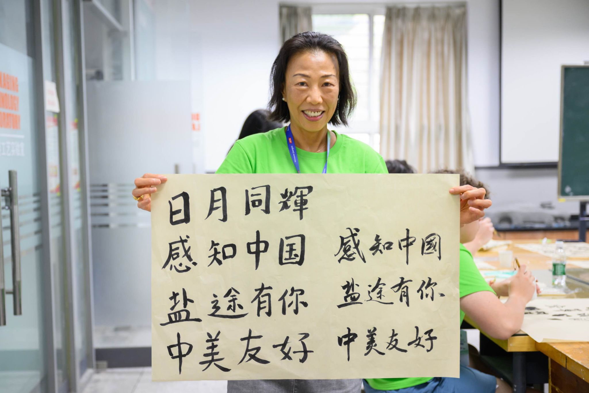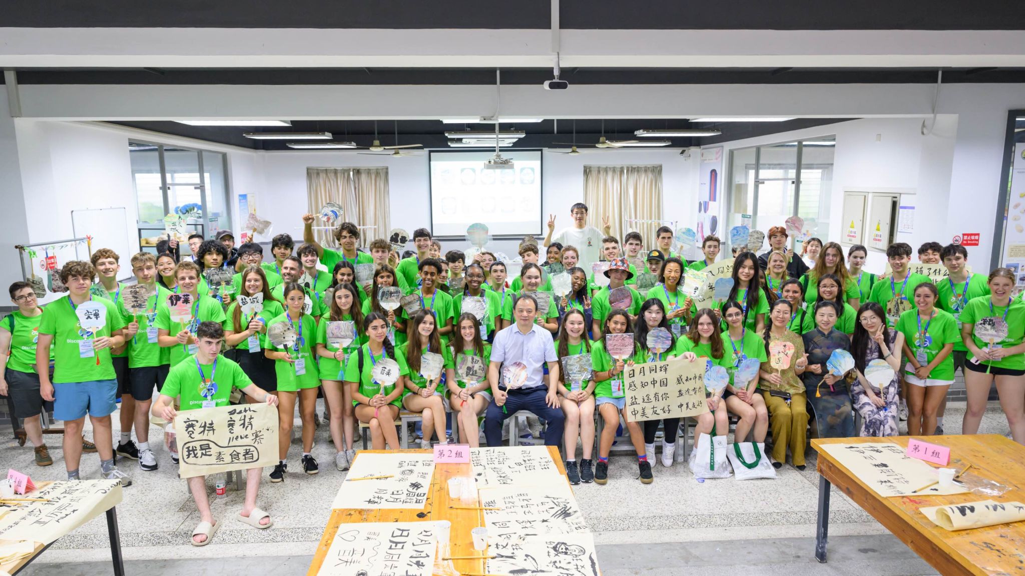 走进书法教室,美国学子们凝神端坐,在徐海涛老师的细致指导下,从握笔姿势学起,感受水墨在宣纸上的呼吸。笔锋流转间,汉字的一横一竖不再仅是符号,更成为跨越语言的审美对话。随后的非遗漆扇制作体验在马丽丽老师的示范下,将气氛推向高潮——五彩漆料滴入清水,瞬间晕染出绚烂纹路,当素白扇面轻触水面,独一无二的花纹便如魔法般跃然其上。年轻的脸庞写满惊叹,指尖触碰的是千年技艺的温度。